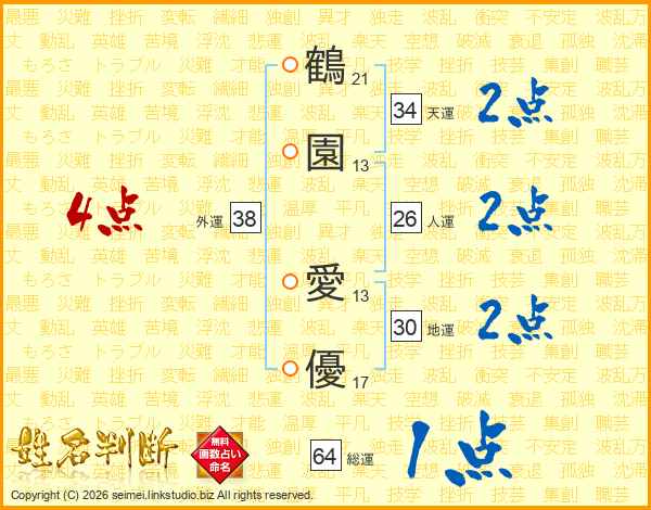 鶴(21画)園(13画) 愛(13画)優(17画)