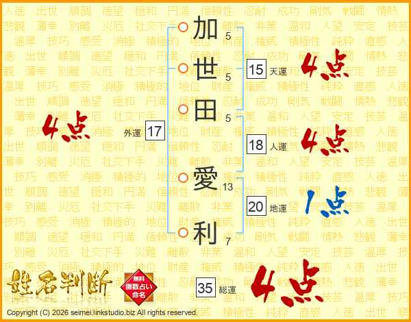 加(5画)世(5画)田(5画) 愛(13画)利(7画)