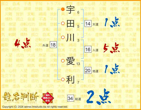 宇田川愛利さんの総運は34画の2点!