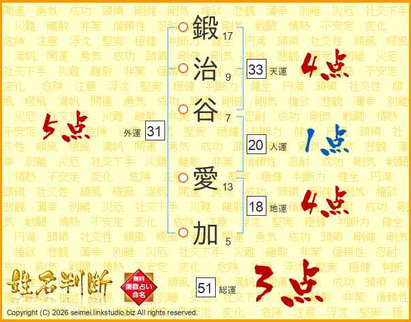 鍛治谷愛加さんの天運は33画の4点!