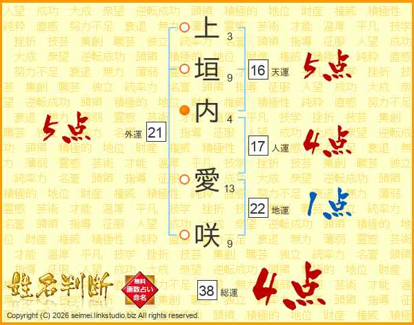 上(3画)垣(9画)内(4画) 愛(13画)咲(9画)