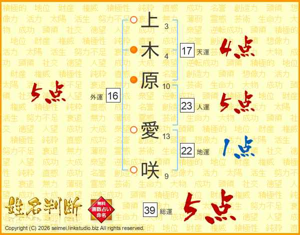 上(3画)木(4画)原(10画) 愛(13画)咲(9画)