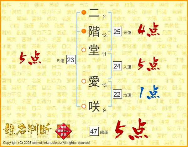 二(2画)階(12画)堂(11画) 愛(13画)咲(9画)