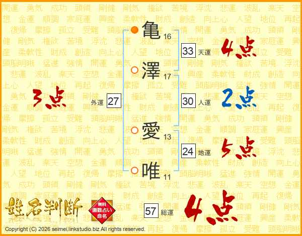 亀(16画)澤(17画) 愛(13画)唯(11画)