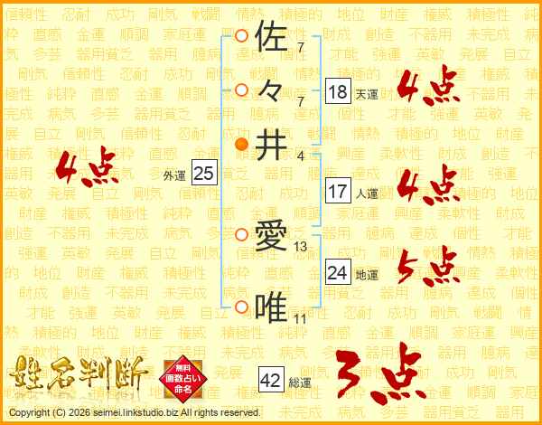 佐(7画)々(7画)井(4画) 愛(13画)唯(11画)