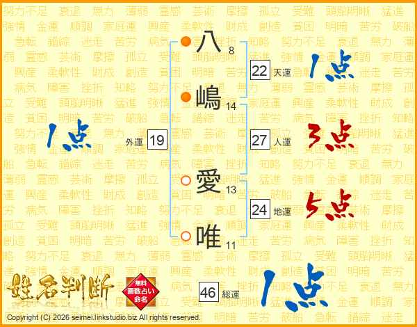 八嶋愛唯さんの総運は46画の1点!