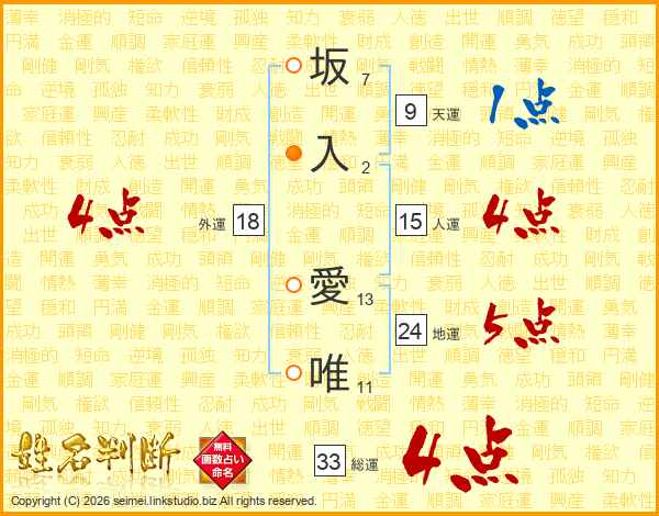 坂(7画)入(2画) 愛(13画)唯(11画)