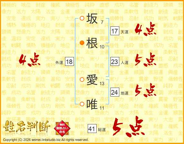 坂(7画)根(10画) 愛(13画)唯(11画)