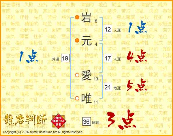 岩(8画)元(4画) 愛(13画)唯(11画)