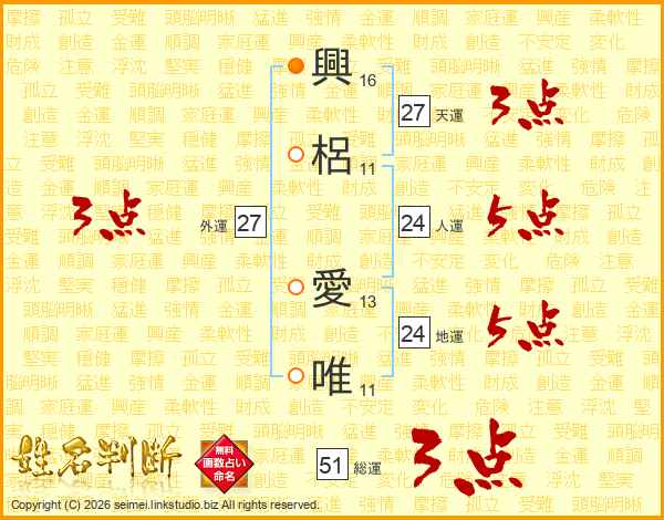 興(16画)梠(11画) 愛(13画)唯(11画)