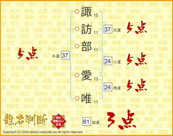 諏(15画)訪(11画)部(11画) 愛(13画)唯(11画)