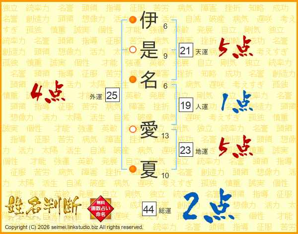 伊(6画)是(9画)名(6画) 愛(13画)夏(10画)