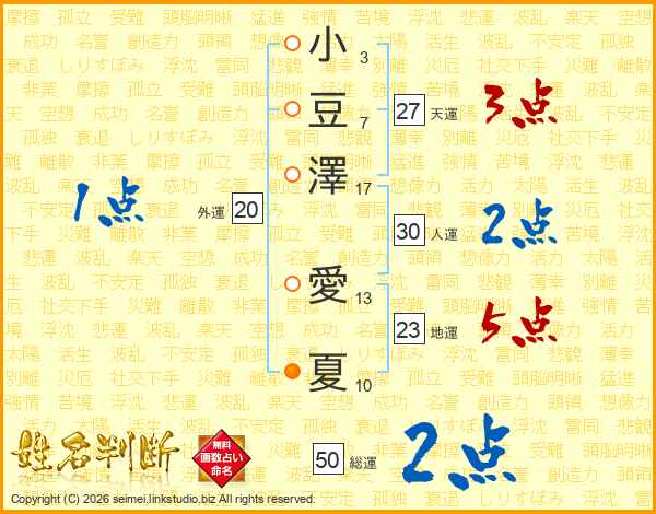 小(3画)豆(7画)澤(17画) 愛(13画)夏(10画)