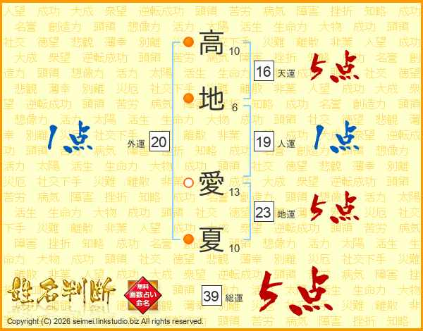 高地愛夏さんの総運は39画の5点!