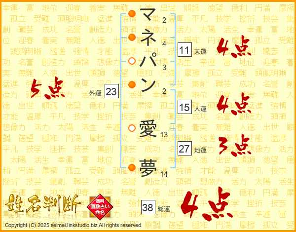 マ(2画)ネ(4画)パ(3画)ン(2画) 愛(13画)夢(14画)