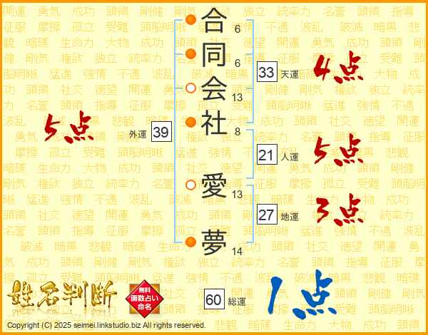 合(6画)同(6画)会(13画)社(8画) 愛(13画)夢(14画)