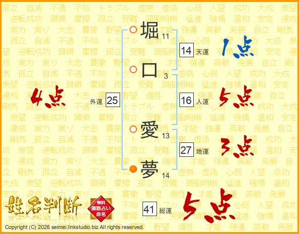 堀(11画)口(3画) 愛(13画)夢(14画)
