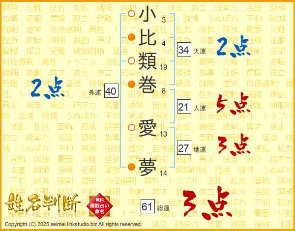 小(3画)比(4画)類(19画)巻(8画) 愛(13画)夢(14画)