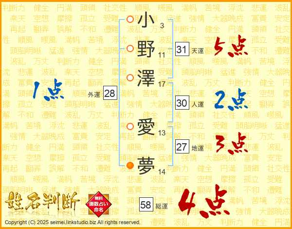 小(3画)野(11画)澤(17画) 愛(13画)夢(14画)
