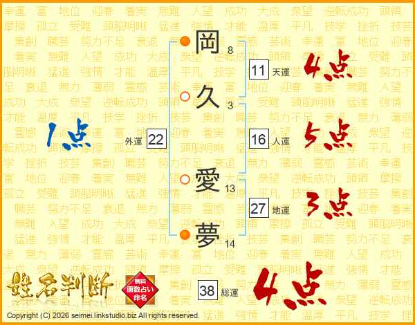 岡久愛夢さんの総運は38画の4点!