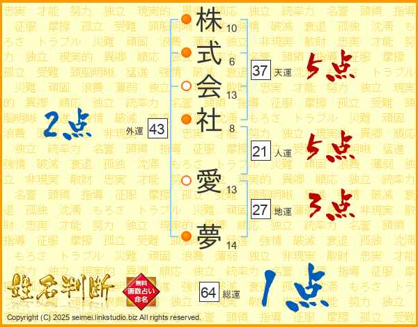 株(10画)式(6画)会(13画)社(8画) 愛(13画)夢(14画)