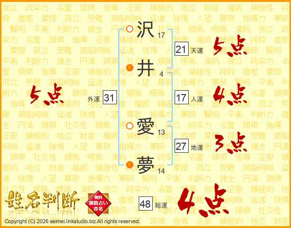 沢(17画)井(4画) 愛(13画)夢(14画)