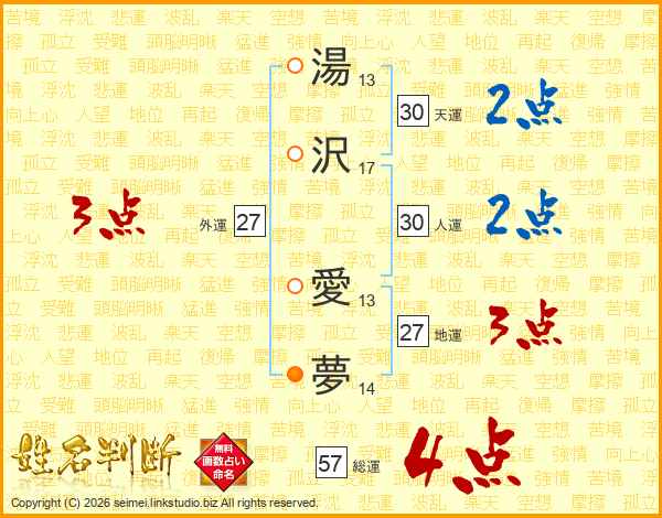 湯沢愛夢さんの総運は57画の4点!