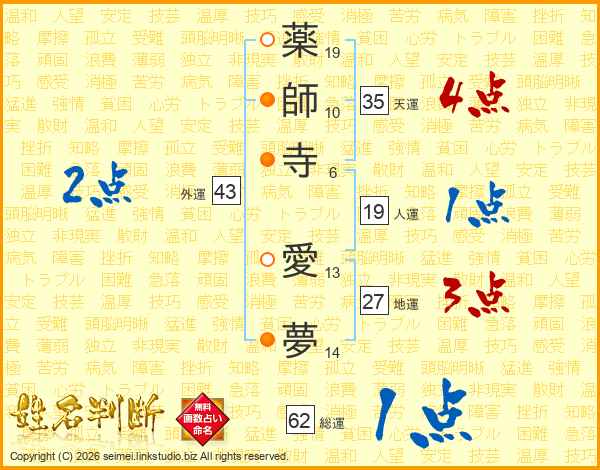 薬師寺愛夢さんの総運は62画の1点!