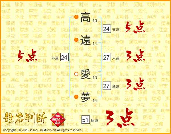 高(10画)遠(14画) 愛(13画)夢(14画)