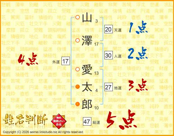 山(3画)澤(17画) 愛(13画)太(4画)郎(10画)