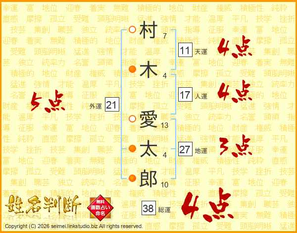 村(7画)木(4画) 愛(13画)太(4画)郎(10画)