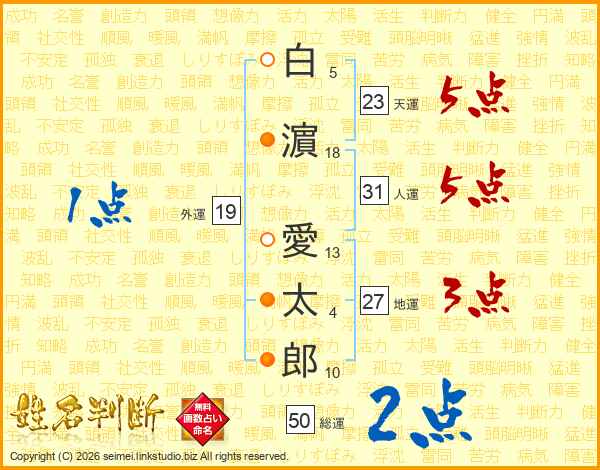 白(5画)濵(18画) 愛(13画)太(4画)郎(10画)