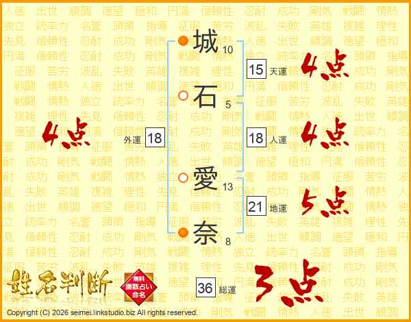 城(10画)石(5画) 愛(13画)奈(8画)