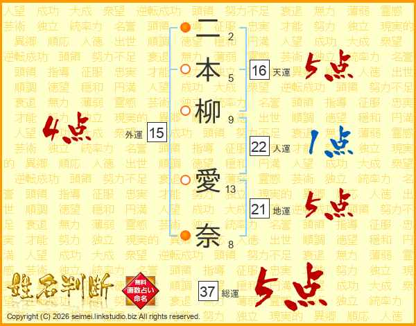 二(2画)本(5画)柳(9画) 愛(13画)奈(8画)