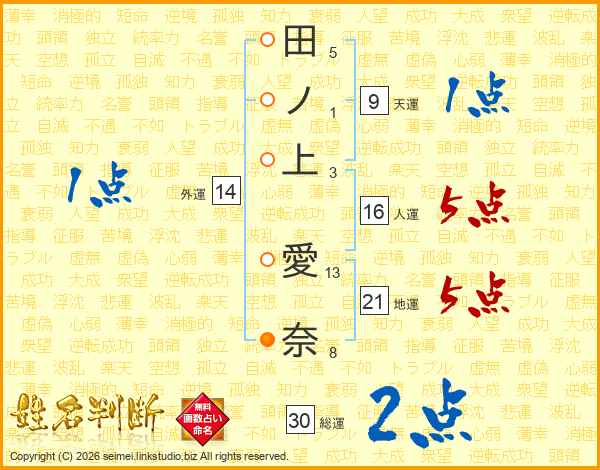 田(5画)ノ(1画)上(3画) 愛(13画)奈(8画)