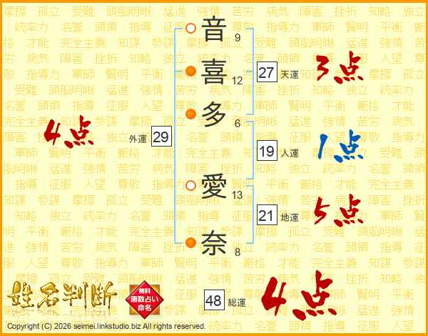 音(9画)喜(12画)多(6画) 愛(13画)奈(8画)