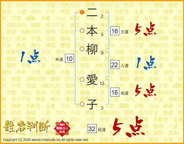 二本柳愛子さんの総運は32画の5点!