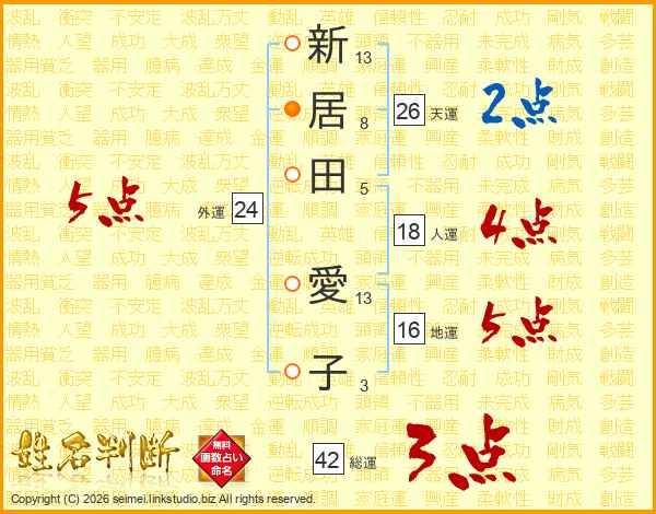 新(13画)居(8画)田(5画) 愛(13画)子(3画)