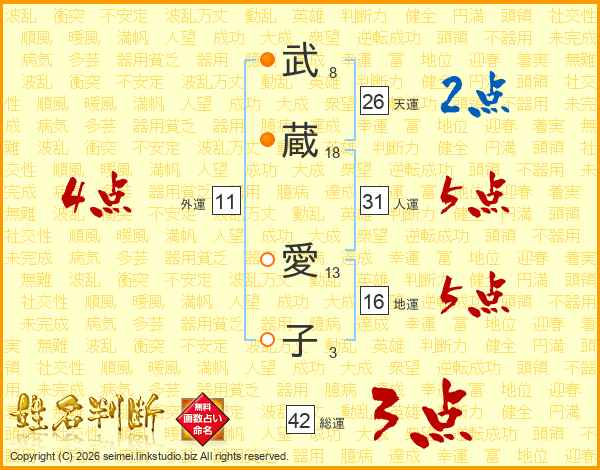武(8画)蔵(18画) 愛(13画)子(3画)