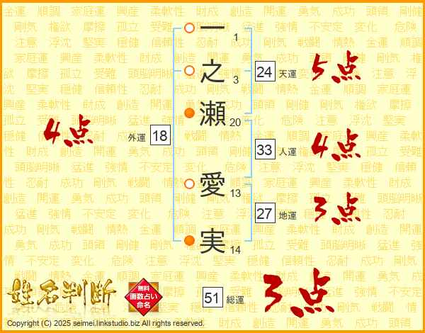 一(1画)之(3画)瀬(20画) 愛(13画)実(14画)
