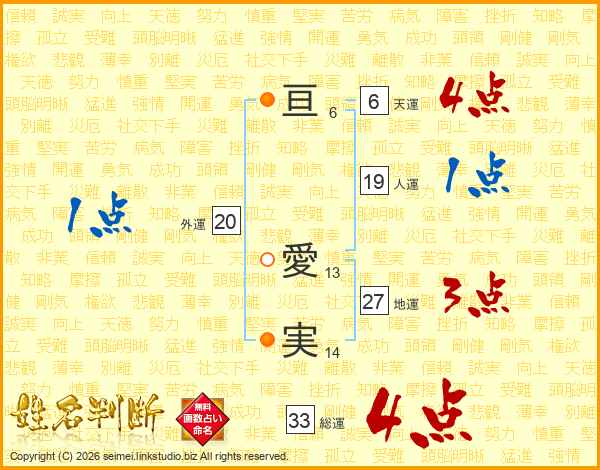 生活面を象徴する運勢です。外部から受ける影響力を表し、結婚運、家庭運や職場、環境への順応性を表します。総運から人運を引いた画数。姓や名が1文字の場合を除く。