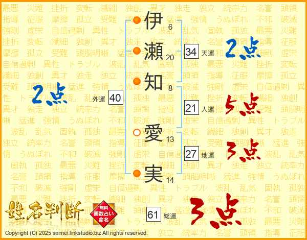 伊(6画)瀬(20画)知(8画) 愛(13画)実(14画)