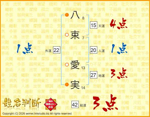 八(8画)束(7画) 愛(13画)実(14画)