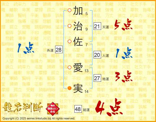 加(5画)治(9画)佐(7画) 愛(13画)実(14画)