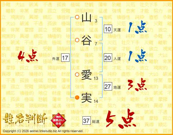 山谷愛実さんの総運は37画の5点!