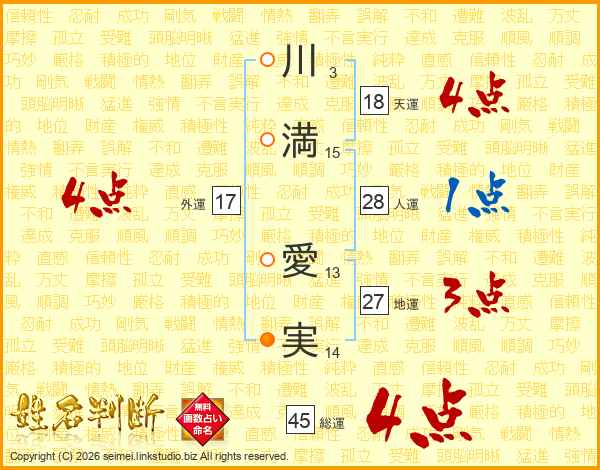 生活面を象徴する運勢です。外部から受ける影響力を表し、結婚運、家庭運や職場、環境への順応性を表します。総運から人運を引いた画数。姓や名が1文字の場合を除く。