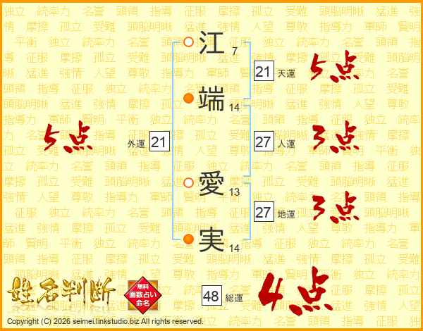 生活面を象徴する運勢です。外部から受ける影響力を表し、結婚運、家庭運や職場、環境への順応性を表します。総運から人運を引いた画数。姓や名が1文字の場合を除く。