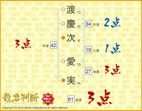 渡(13画)慶(15画)次(6画) 愛(13画)実(14画)