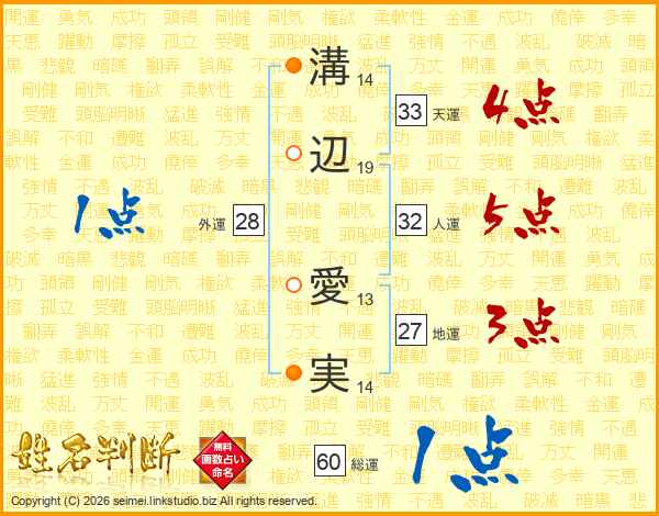 溝(14画)辺(19画) 愛(13画)実(14画)