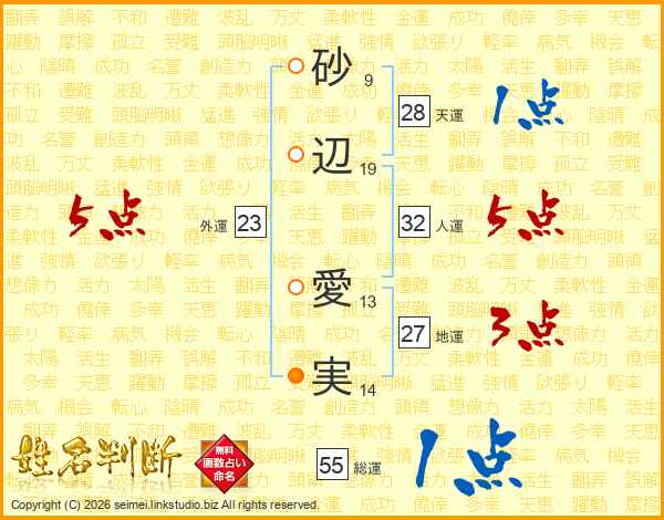 砂(9画)辺(19画) 愛(13画)実(14画)